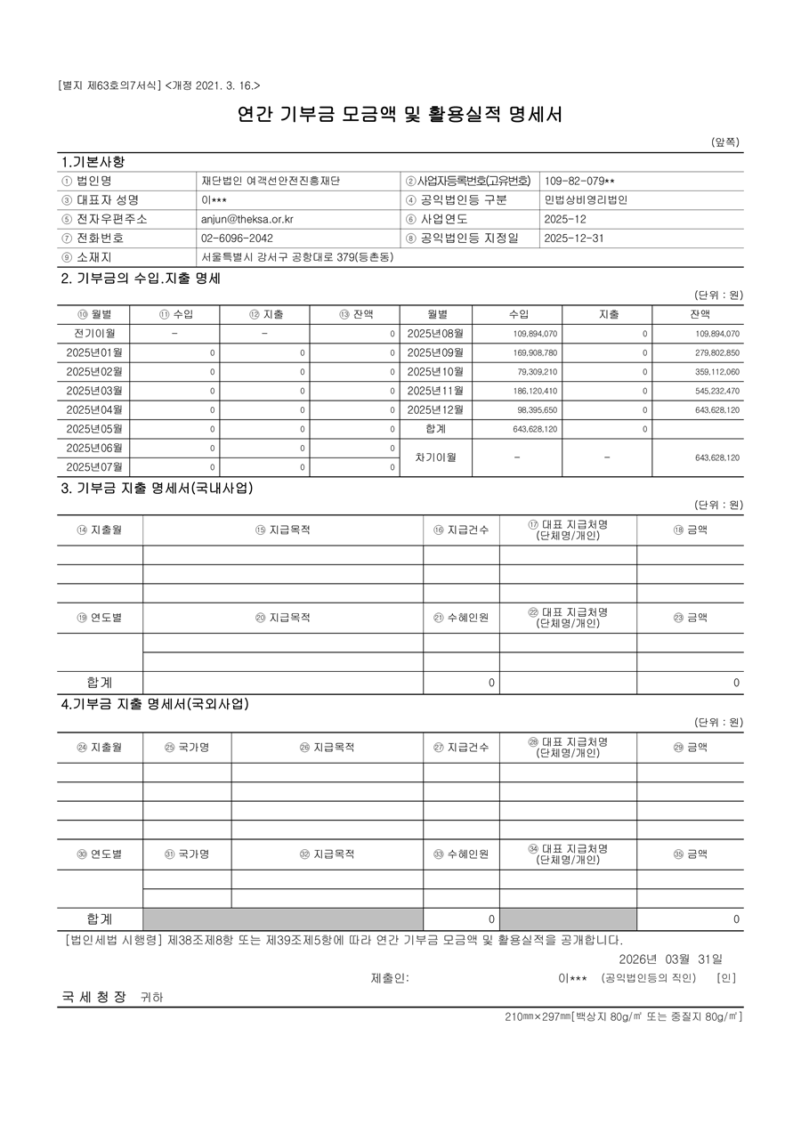 | 제목 | 2025년도 연간 기부금 모금액 및 활용실적 명세 | ||||